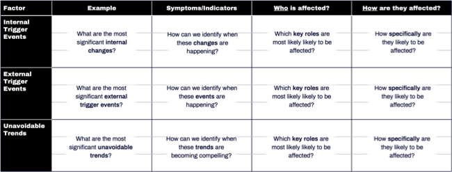 External trigger events are initiated outside the organizations that are primarily affected by them. Common examples include new legislation or regulation, new competitors, new technologies, one-off events and so on.